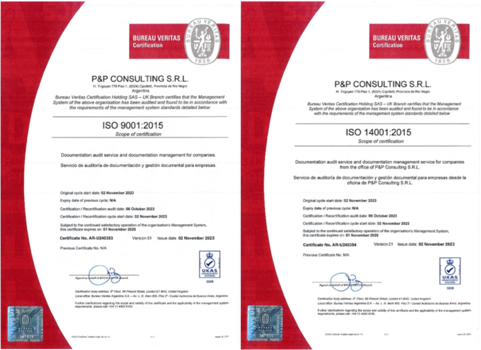 Queremos compartir con uds nuestras certificaciones ya que son parte de ellas. Hemos certificado ISO 9001-2015 y 14001-2015 en Auditoría y Gestión Documental para empresas. Todos nos conocen en auditorías y que hemos sido los pioneros en eliminar el papel del control documental y que seguimos innovando constantemente en procesos. Los certificados no solo afirman esto, sino que también tenemos el compromiso en mantenerlo y hacer más cada día, involucrando a clientes, contratistas y proveedores para ser entre todos, empresas que trabajan mejorando continuamente los procesos de calidad y medio ambiente.
