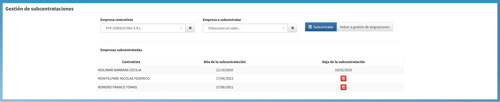 ¡Eliminación de Subcontrataciones! ya tienen disponibles para eliminar subcontrataciones que ya no usan. Para hacerlo solicitamos que ingresen a GESTION - ASIGNACIONES - SUBCONTRATAR. Allí encontrarán todas las subcontrataciones realizadas hasta el momento y podrán eliminar las mismas. Esto significa que todo lo relacionado a ella, se desafectará automáticamente de todos los contratos donde están asignadas.